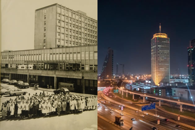 Ealing Hospital opening in 1979 (left) and the Dubai World Trade Centre (right)