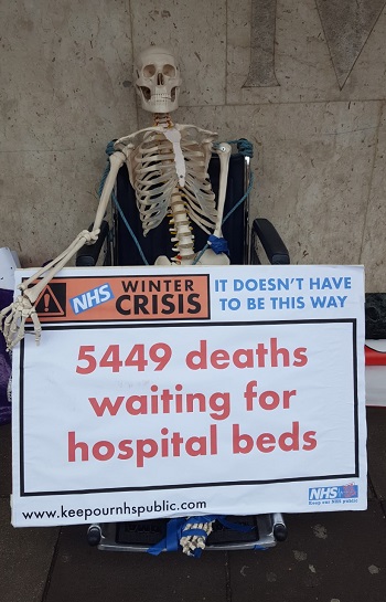 To highlight the situation, campaigners placed a full size skeleton in a wheelchair, being attended to far too late by an overworked doctor, while another ‘sick patient’ lay in a makeshift bed in a corridor.
