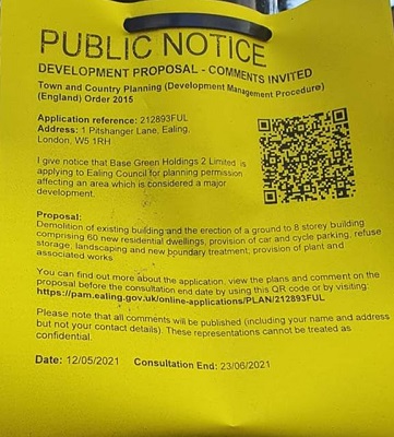 Pitshanger Community Association has prepared a guidance document for those commenting and suggest ward councillors and the local MP, James Murray, are contacted too.