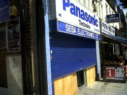 At around midnight on the 8th August a large number of people attacked the premises causing extensive damage to shutters and windows. The shop was broken into and stock including TVs DVD recorders, computers and microwaves to the approximate value of £200,000 was stolen.