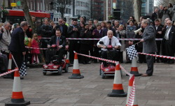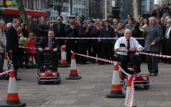 Broadcaster John Sergeant waved the chequered flag to start a scooter race between Steve Pound MSP and Council Leader, Councillor Julian Bell. Deputy Mayor, Councillor John Gallagher also helped with starting duties (pictured below right).