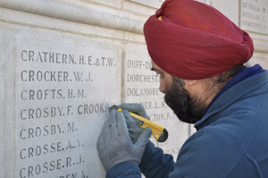 He and members of the family - including Harry's great nephew and two great nieces - attended Ealing War Memorial on Ealing Green on Friday (27 February) as the final pieces of lead were expertly hammered into the memorial by stonemason Manjit Phull to mark out HH Crook in the stone.