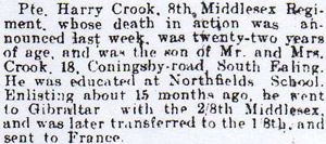 Herbert Crook, known as Harry, was born in Ealing in December 1893. He lived with his parents Edwin and Annette at various addresses in the town, including Haven Place or Sandringham Mews, Green Avenue, Mountfield Road and Conningsby Road.