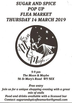 Sugar and Spice Flea Market is popping up at The Moon & Maybe cafe, South Ealing on Thursday 14th March 5-9pm.