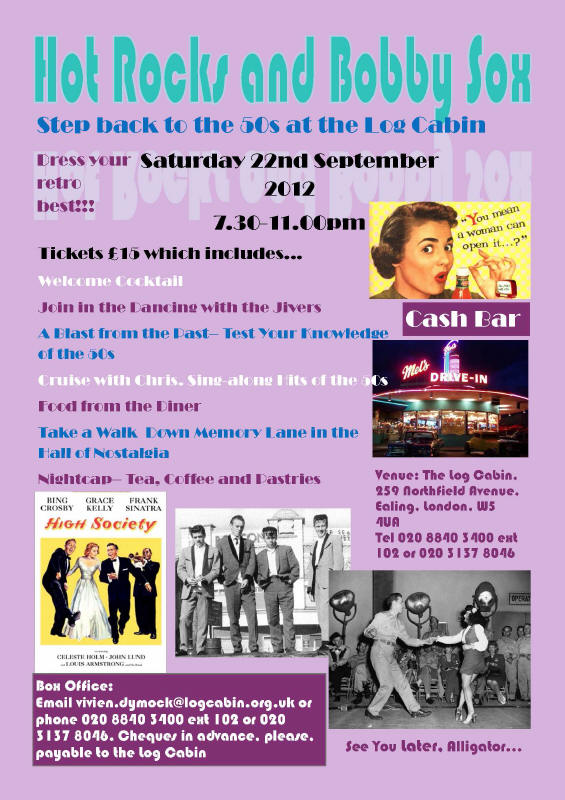 Join us at the Log Cabin on Saturday 22 September 2012 at 7.30 pm for what promises to be a brilliant and lively evening of jive, rock’n’roll, songs from the 50s, a walk down memory lane and food from the diner. Join Chris in a sing-along, and the Jivers as they lead you a merry dance!