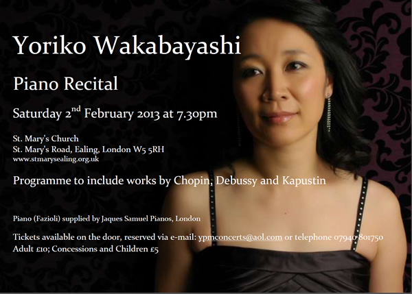 Yoriko Wakabayashi was born in Tokyo and has been based in London, living in Ealing, for over 20 years. She studied at The Royal Academy of Music winning numerous prizes including the MacFarren Medal, the Academy’s highest performance award, which subsequently led to her London recital debut at The Southbank Centre.