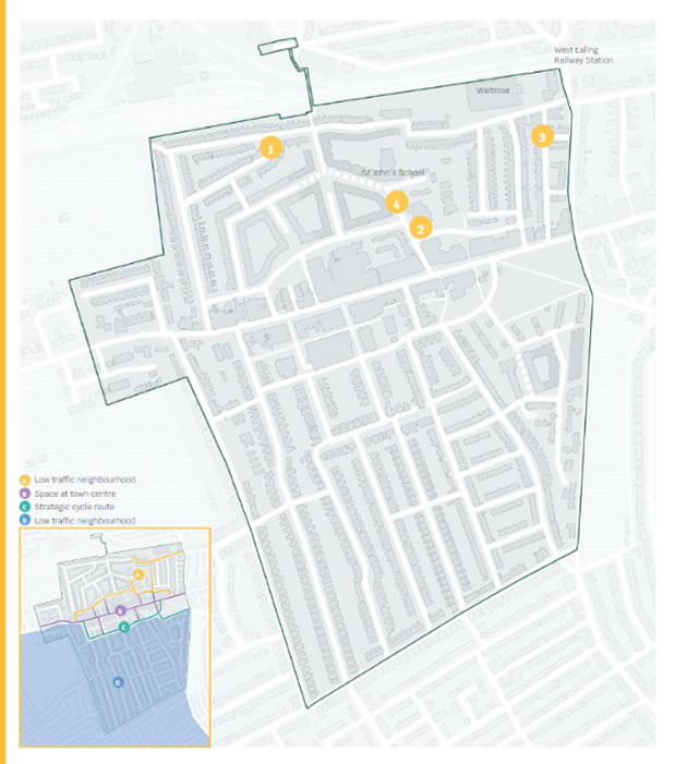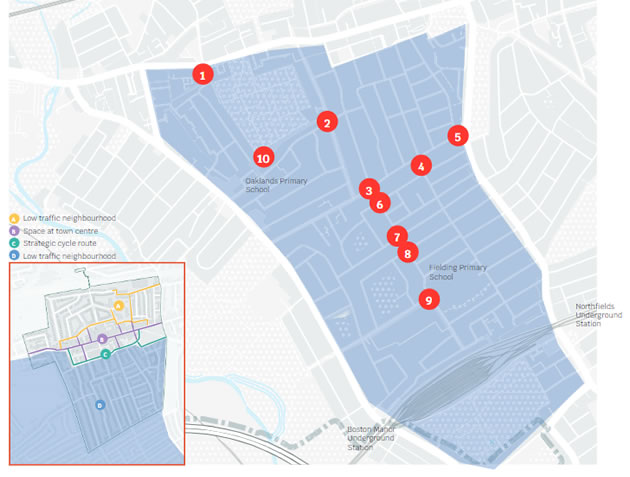 The Low Traffic Neighbourhood scheme for North of the Broadway proposes access restrictions (or filtered permeability) at the junction of Endsleigh Road and Felix Road, Green Man Lane between Singapore Road and Witham Road and at the junction of Kirchen and Lancing Road. It is also proposed to create a school street with temporary timed closures on Green Man Lane north of the Singapore Road junction.