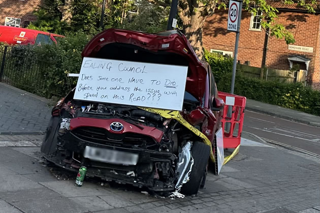An image of a car wreckage with a sign reading “Ealing Council – does someone have to die before you address the issue with speed on this road???” shared on social media has caused an outpouring of anger by the community who say speed limits simply aren’t being enforced in the borough.