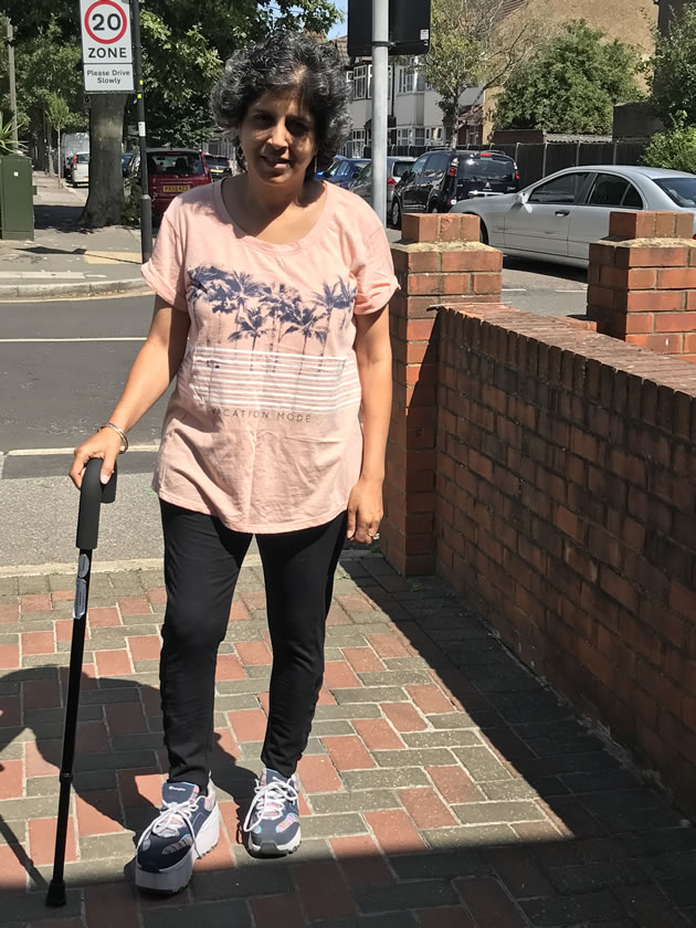Her chemotherapy treatment is ongoing, and she now relies on a walking stick and a thick-soled shoe after her leg was shortened as a result of complications stemming from the cancer.