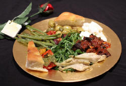 We were given a veggie hamper to try, so, on a bleak, freezing cold February evening, we sat down to this most beautiful summery antipasti spread. There was focaccia, baby cherry tomatoes, Puglian olives, bell peppers with pesto, globe artichokes, green beans and mozzarella cheese. My type of food.