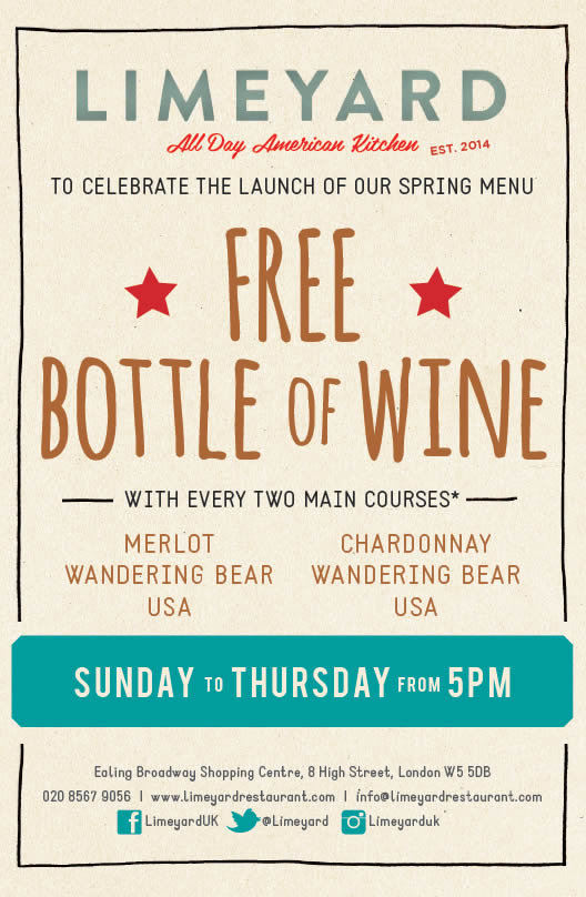 Limeyard, the All Day American Kitchen, is offering customers a free bottle of wine to celebrate the launch of their spring menu. Customers ordering two main courses Sundays to Thursdays after 5pm can choose between a bottle of Wandering Bear Merlot or Wandering Bear Chardonnary.