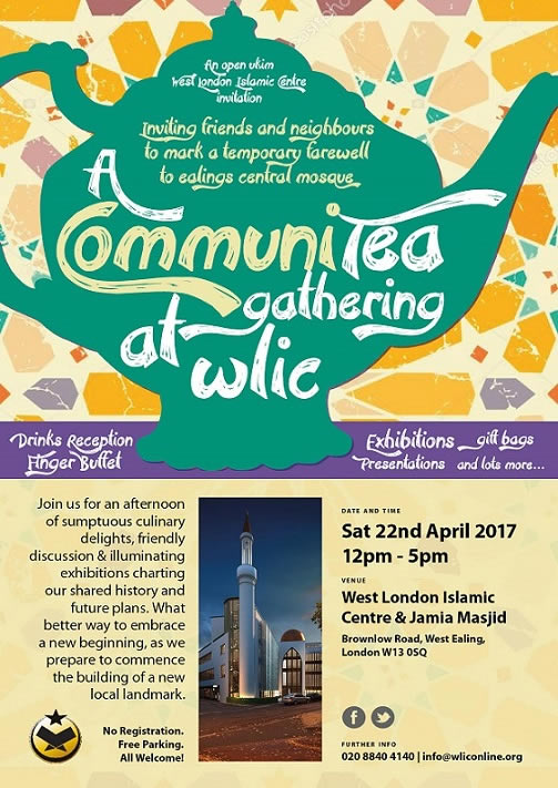 It is with great pleasure that the West London Islamic Centre on Brownlow Road, West Ealing W13, invites our friends and neighbours to a temporary, farewell occasion and community gathering to mark the closure of the Centre, in preparation for its re-development and the building of a new local landmark.