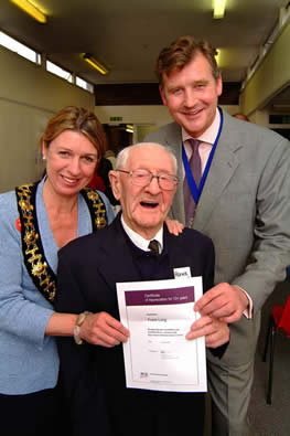 Mayor of Hammersmith&Fulham, Cllr Minnie Scott Russell, and her consort, Mr Harry Spencer-Smith, present a certificate to 96 year old volunteer Frank Long. |