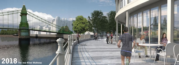 The river walkway has also been opened up  for the first time in front of Riverside Studios and Queen's Wharf allowing the public to walk beside the river all the way from Barnes Bridge to Craven Cottage.