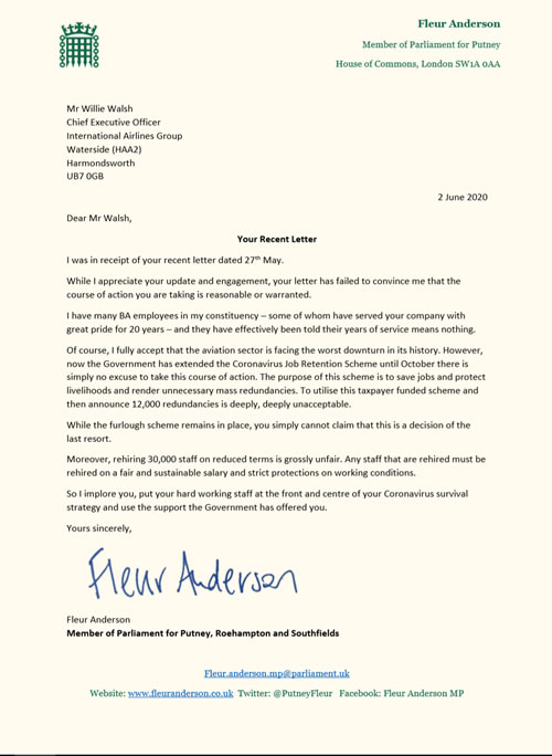 Labour MP for Putney, Roehampton and Southfields, Fleur Anderson has written to the Prime Minister and the Chief Executive of International Airlines Group (IAG) urging them to U-turn the planned redundancy of 12,000 British Airways staff.