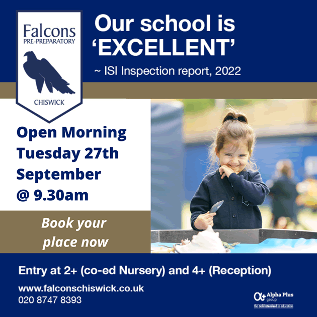 Their next Open Morning is being held on Tuesday 27th September from 9.30am and provides a great opportunity to meet the Head and other teachers and see the school in action. Places may be booked via their website or by contacting the school on 020 8747 8393 or admissions@falconschiswick.co.uk