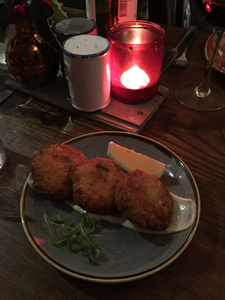 From the dinner menu, amongst the half dozen or so starters, the Smoked Bacon and Potato Scotch egg, with properly runny yolk, was declared delicious, as were the crab cakes. For me, nothing beats the calamari which have no hint of rubberiness but, having been marinated in milk and garlic and coated in a light, nicely seasoned batter, are tender and succulent.
