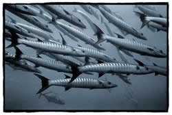 Of his current exhibition, Peter says: "  Holiday snaps of fish did not appeal and having seen wonderful colour work that must have taken years of dedication by underwater specialists to obtain, I hit on the simple idea of fast black and white film using a basic Nikon Nikonos V and available light.