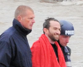 The race marshall was forced to halt both crews after Trenton Oldfield, aged 35, was narrowly missed by the oars of the Oxford crew. He was taken ashore at Chiswick Pier by the Chiswick RNLI lifeboat where eye witnesses report that he received a hostile reception being booed by onlookers.