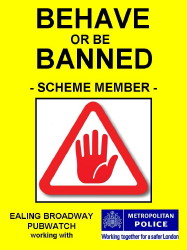 Any person arrested in Ealing Broadway for alcohol-related crime or disorder may receive a ban from the PubWatch which prevents them entering the premises of any scheme members - banned from one means banned from all.