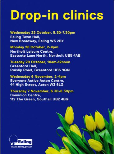 • Tuesday 29 October, 10am-12noon – Greenford Hall, Ruislip Road, Greenford UB6 9QN