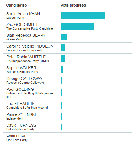 Sadiq Khan is the city's new mayor, after beating Tory Zac Goldsmith by 1,310,143 votes to 994,614. He secured the largest majority ever for a London Mayor. The confirmation of the result was delayed due to problems with London Elect's electronic vote counting system.
