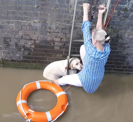 On arrival they found a woman up to her knees in the river clinging on to a ladder; she was hanging on to her dog who was mostly in the water. The dog had slipped under the railings alongside the Thames and then lost its footing and fallen in.