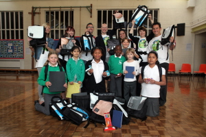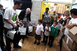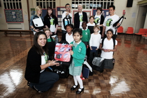 The children at Green Dragon Primary School are the UK beneficiaries of a 2009 global drive to fill 1,500 backpacks with school supplies for children in London, Miami, New York and Washington D.C.