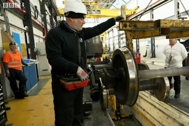 Transport for London engineers are working to smooth out the ‘wheel flats’ using a lathe at a workshop at the Cockfosters depot which was visited recently by the BBC’s transport correspondent Tom Edwards. This process takes about a day per train, and it is hoped that the work on all the damaged wheels will be complete by the end of the month.