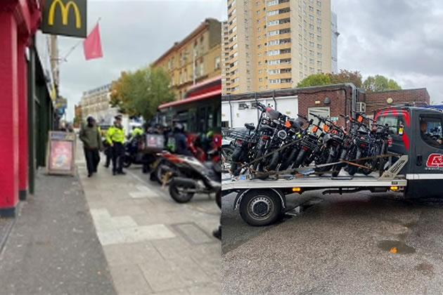 Left: Police checking vehicles on Acton High Street. Right: The haul of confiscated bikes