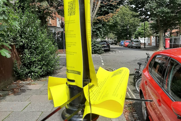 He said, “You used to get letters. Then they stopped the letters and notices appeared on lampposts. More recently these have been upgraded to dayglow yellow notices attached to lampposts with environmentally unfriendly plastic cables.”