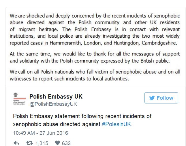 Whilst the country has voted to leave the EU, it is not a xenophobic vote. It had been a vote to regain the control of our economy, our justice system, and our borders. We condemn any xenophobic and racist attacks against Poles and any other heritage that enrich the British Isles. The United Kingdom is made up of many migrants over the decades and we should look forward to work together to build an even stronger nation in the next era of history."