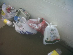 Green boxes and white bags full of glass, plastics along with food recycling - all due to be cleared away were left on the pavements.