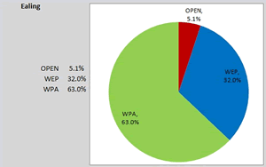 Ealing Borough came off slightly worse than average with over 37% of households failing to secure their WiFi network adequately. (See pie chart, right)