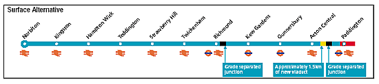 If the surface option were to be taken with the line running via Acton, Crossrail services would replace some District line trains between Gunnersbury and Richmond. These trains could be diverted to enhance the service to Wimbledon.