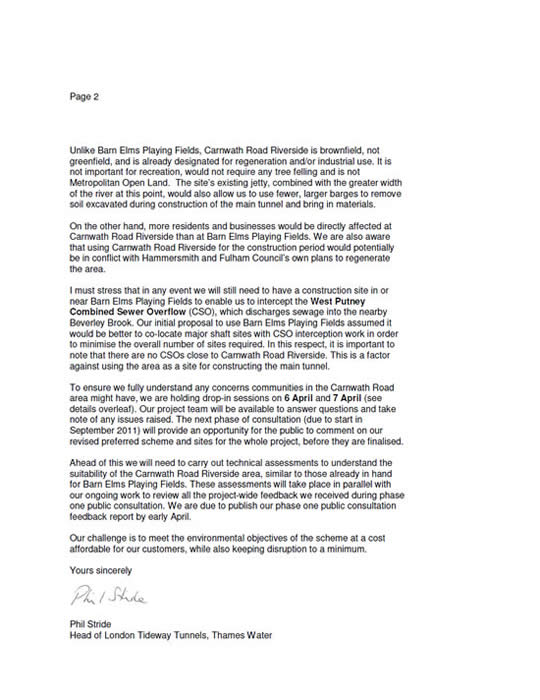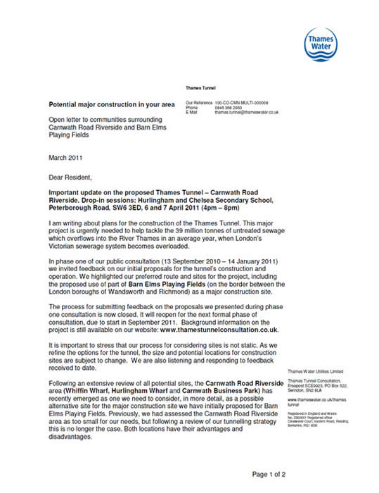Thames Water's Letter to Residents Regarding Barn Elms & Carnwath Road Sites