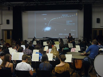 Nina Whiteman, who has worked with the orchestra extensively to help them prepare, including giving a presentation on astrophysics (see photograph), says: “They are a really enthusiastic exuberant group; the response has been very imaginative and they have taken on some quite difficult scientific concepts.”
