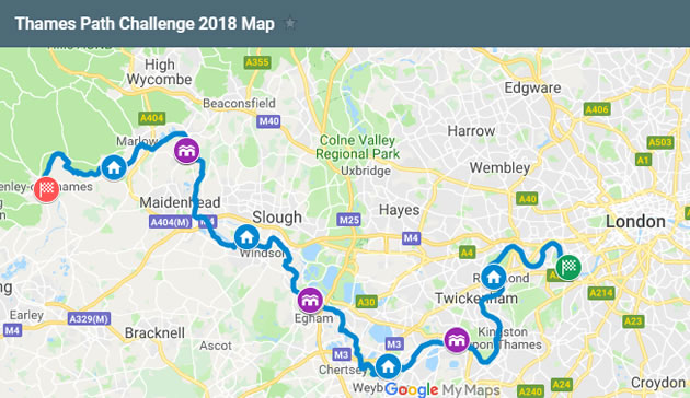 The full Thames Path Challenge 100km route on 7th & 8th September heads from Putney Bridge past Hampton Court to Runnymede of Magna Carta fame at 50km, then on past wonderful scenery that's steeped in history all the way to Henley.