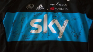 Cyclists, Bradley Wiggins, Mark Cavendish and Chris Froome are just three members of Team Sky who have signed a shirt donated by Sky to St Vincent’s RC Primary School in Acton for auction at the school’s Christmas Fair on 15 December.