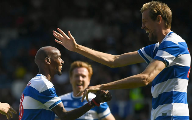 Sir Mo Farah congratulated by Peter Crouch. Picture: QPR