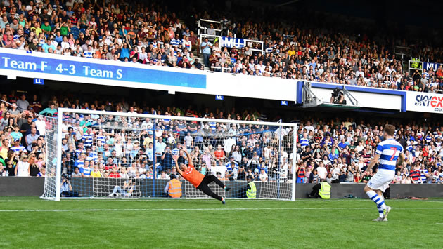 Olly Murs smashes a penalty passed 'the Special One'. Picture: QPR