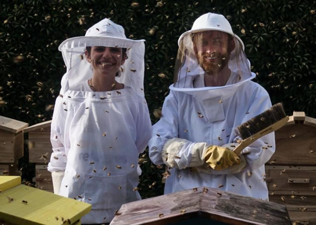Ali Alzein and a woman stood behind beehives with bees swarming around them