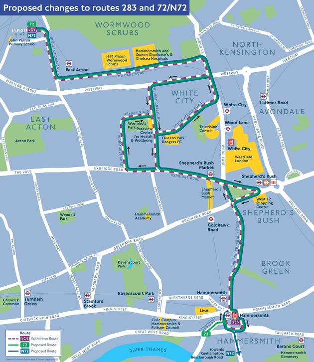 Transport for London (TfL) has announced plans to withdraw bus route 283, which currently runs between Hammersmith Bus Station and East Acton. The proposed change is part of a wider set of adjustments to services along the corridor shared with route 72 and night route N72.