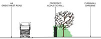 Furnivall Gardens, the stretch of green running from the A4 along the river at Hammersmith, is at the moment blighted by traffic noise. The group, Friends of Furnivall Gardens have been developing an initiative to lower the amount of noise reaching Furnivall Gardens. Their plans include building a 2.5m high acoustic and visual barrier along the edge of the park to make it a more enjoyable place for the public to spend time.