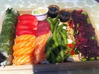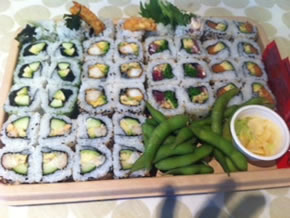 The order was for two sharing platters, one a Sushi Roll platter, (4-6 people) the second was the Gluten-Free , for two-four people. We also orderered some vegetables and Teriyaki Wings.The platters arrived promptly and there was great excitement as they were unpacked. The chicken wings were on the tepid side, so I popped them into the oven to heat them up. The delivery came with sachets of soy sauce and wooden chopsticks and there was wasabi sauce and ginger included on each platter.