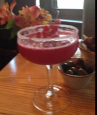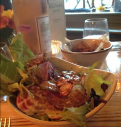 We kicked off with a red cocktail garnished with a sprig of red currants - don't know what it was called but it was delicious. Then on to the food. To start we shared a salad with a nicely balanced mustard and honey dressing.