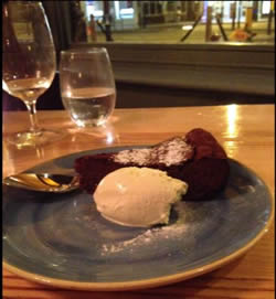 For mains we had goats cheese melted over quinoa grains with porcini mushrooms, and a veggie burger on a gluten free bun with thin chips, not quite skinny enough to be called French fries, with pots of mayo and tomato ketchup.