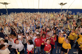 The children, from more than fifty schools across the borough of Hounslow took up the challenge at Dukes Meadows sports centre in Chiswick today (June 26), a local centre which specialises in coaching children in tennis. The event was timed to coincide with Wimbledon.