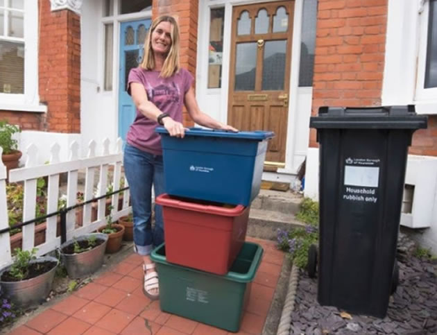 and blue recycling boxes and weekly recycling collections by the Recycle