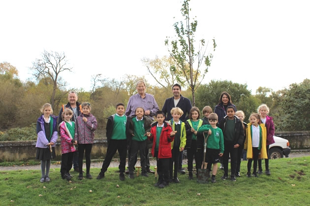 Cllr Shaheen with pupils from Green Dragon Primary School planting at Watermans Park